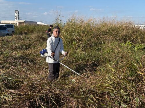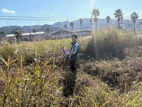 11月22日日野曽根のクリニックモールの草刈りです。久しぶりに行くと草が人の高さまで伸びています。石橋先生・〇