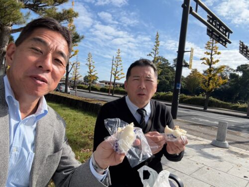 計画」の為ならんで食べることに。おっさん二人の肉まん食べる姿絵になりません