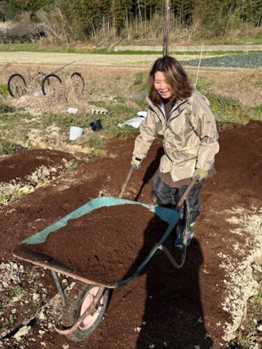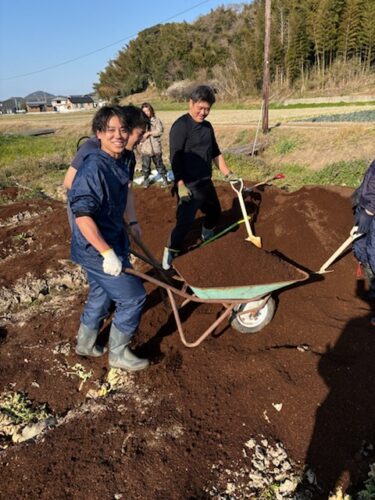 女性陣も一輪車で牛糞をまきます